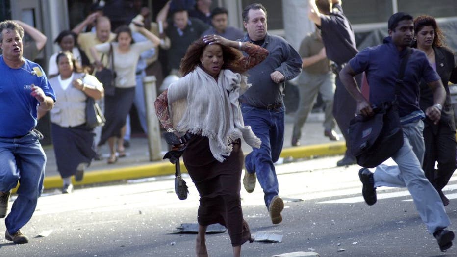 FILE - People scramble for cover under a shower of debris after the World Trade Center is struck in a terrorist attack on September 11, 2001 in New York City.