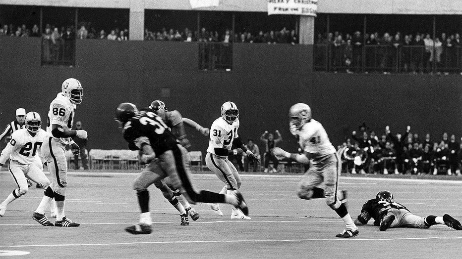 Original caption: Steeler running back Franco Harris picks up a couple of yards in the 2nd quarter before being pulled down by Oakland Raiders Gerald Irons (86) and Dan Conners (55). (Bettmann via Getty Images)
