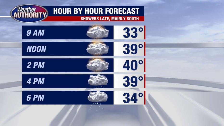 Wet snow or rain moves in late afternoon and evening, but accumulation will be limited, mainly south and on the grass, with plenty of melting.