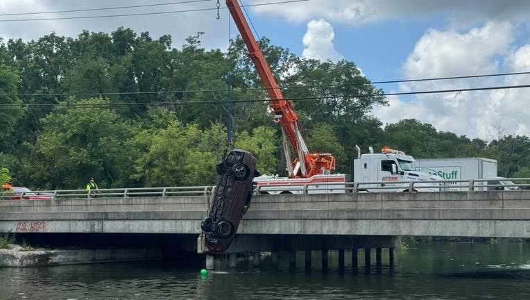 The 1997 red convertible Mustang was recovered via crane on Monday.