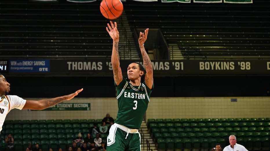 YPSILANTI, MI - FEBRUARY 15: Eastern Michigan Eagles guard Jalen Terry (3) shoots a three during the Eastern Michigan Eagles vs the Toledo Rockets game on Saturday February 15, 2025 at George Gervin GameAbove Center in Ypsilanti, MI. (Photo by Steven