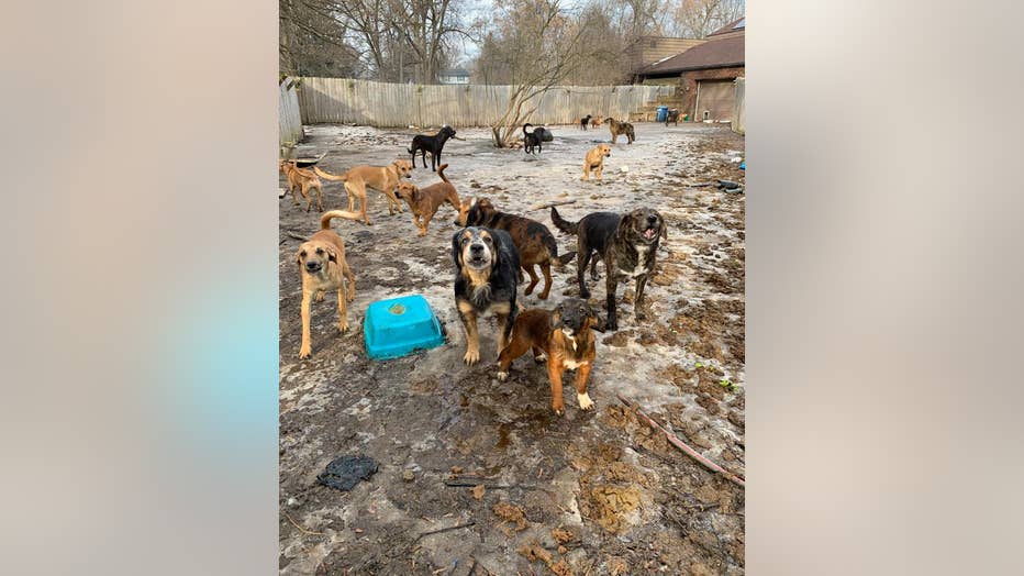 According to Flint Township police, there were 61 living dogs and three cats inside the home. Another 26 deceased dogs and one dead cat were found in trash bags near the front door of the house.