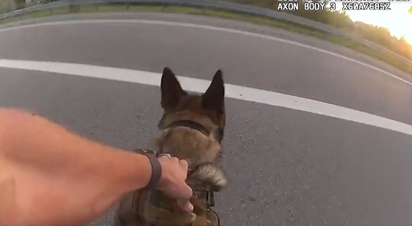 Police did not see the suspect in the area, and Bear and his handler, Officer Brian Anderson, started to leave. However, the suspect ran across M-5 in front of the police vehicle as they were leaving. The suspect continued across both sides of the road and into tall grass.
