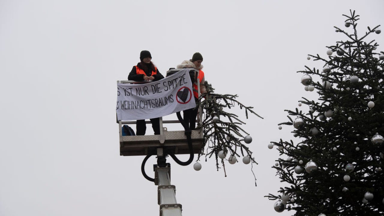 The group Last Generation said two of its members used a hydraulic lift and a hand saw to cut two meters (six feet) off the top of the 15-meter (50-foot) tree and hang up a banner stating: "This is only the tip of the Christmas tree."