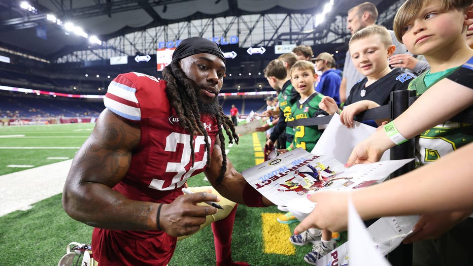 DETROIT, MICHIGAN - APRIL 18: Kedrick Whitehead #32 of Michigan Panthers signs autographs prior to a game against the Memphis Showboats at Ford Field on April 18, 2025 in Detroit, Michigan. (Photo by Gregory Shamus/UFL/Getty Images)