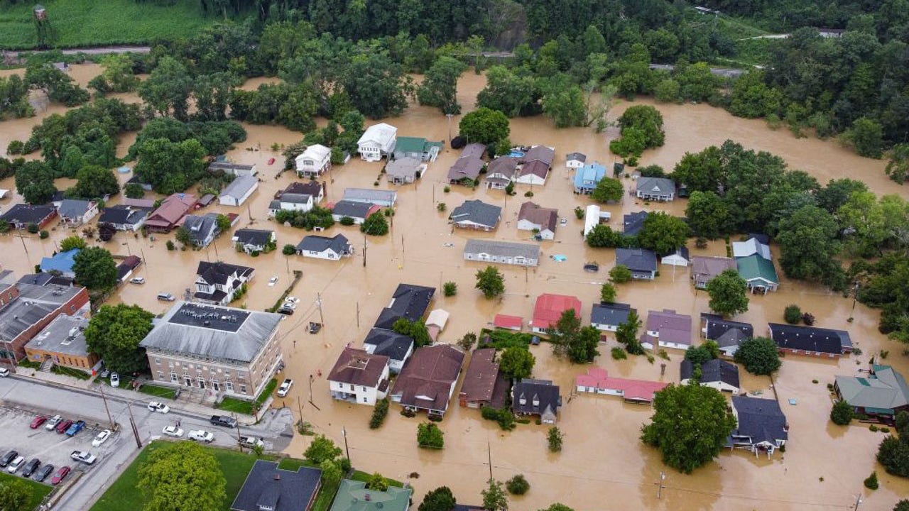 Aerial view of homes submerged under flood waters from the North Fork of the Kentucky River in Jackson, Kentucky, on July 28, 2022. -(Photo by LEANDRO LOZADA/AFP via Getty Images)