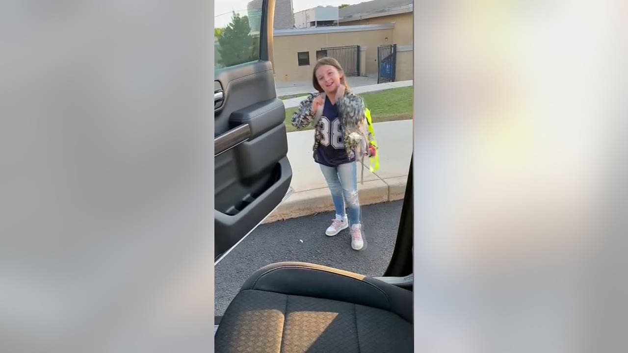 Video shows her dad, Brandon, in a Michael Irvin jersey giving her a huge hug outside of school and bringing a smile to her face.