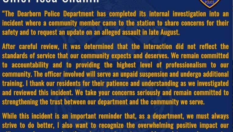 Dearborn Police Chief Issa Shanin said that the unnamed officer will serve an unpaid suspension and undergo additional training.