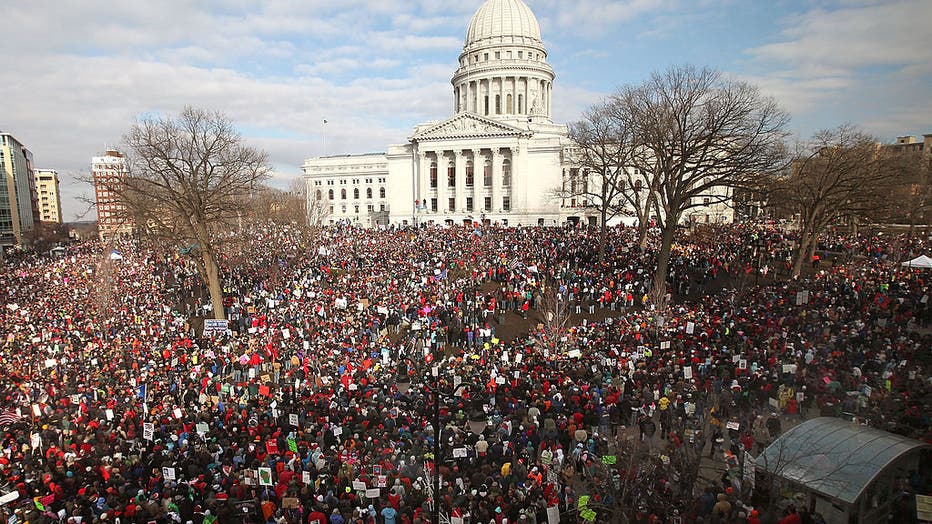 Thousands of demonstrators protest outside the Wisconsin State Capitol March 12, 2011 in Madison, Wisconsin. (Photo by Scott Olson/Getty Images)