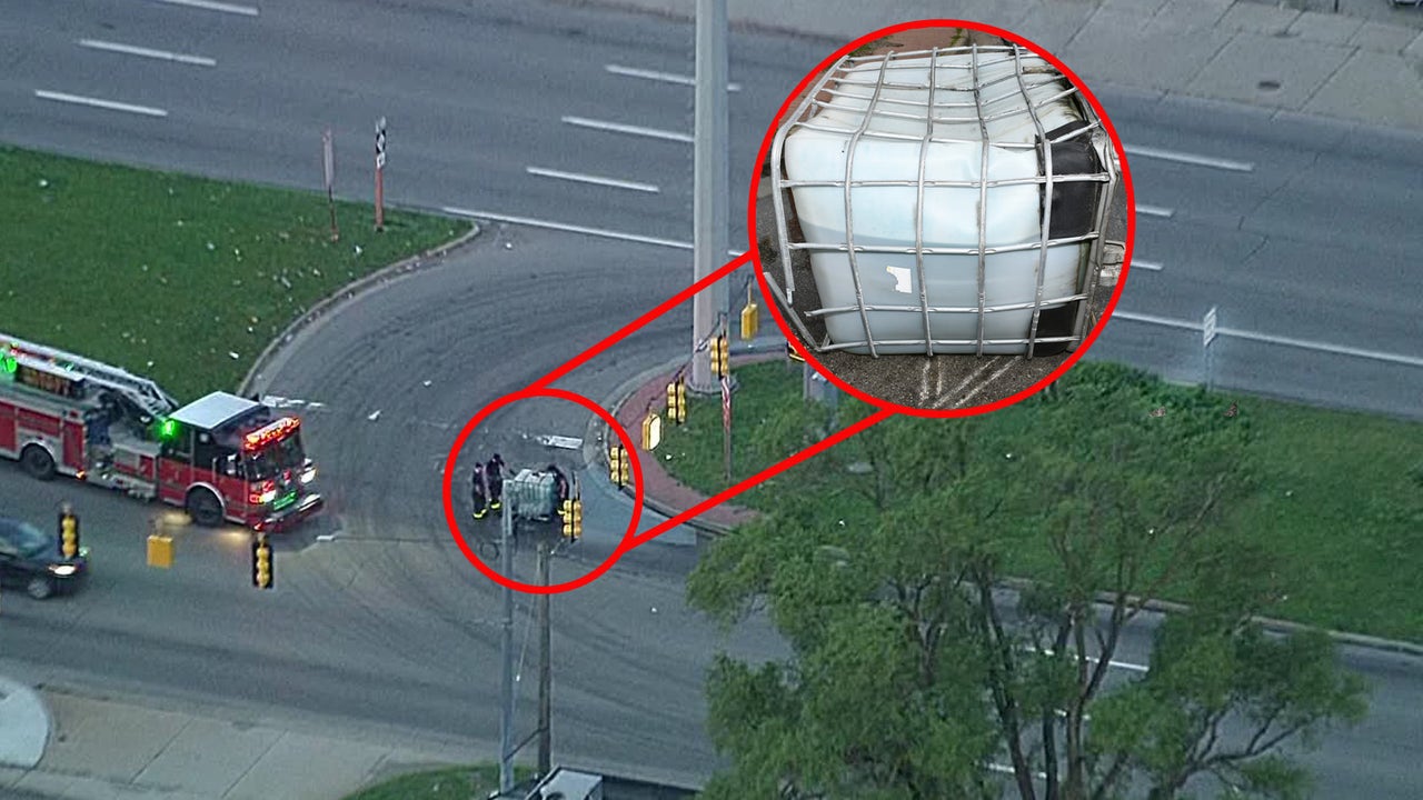 The container had no identifying markers, and police are now working to find the person who dropped it. The truck, which also appeared to have a yellow cage in the bed, was last seen traveling north on Van Dyke to Stephens.