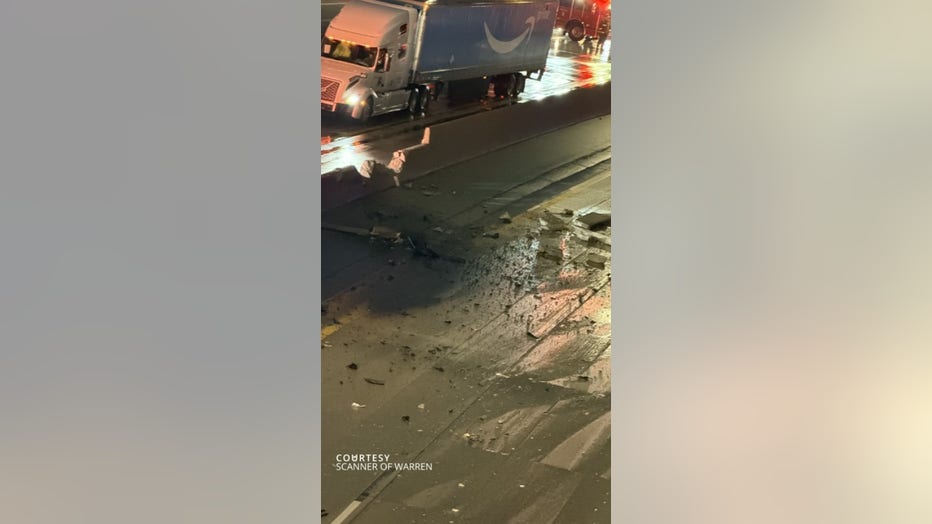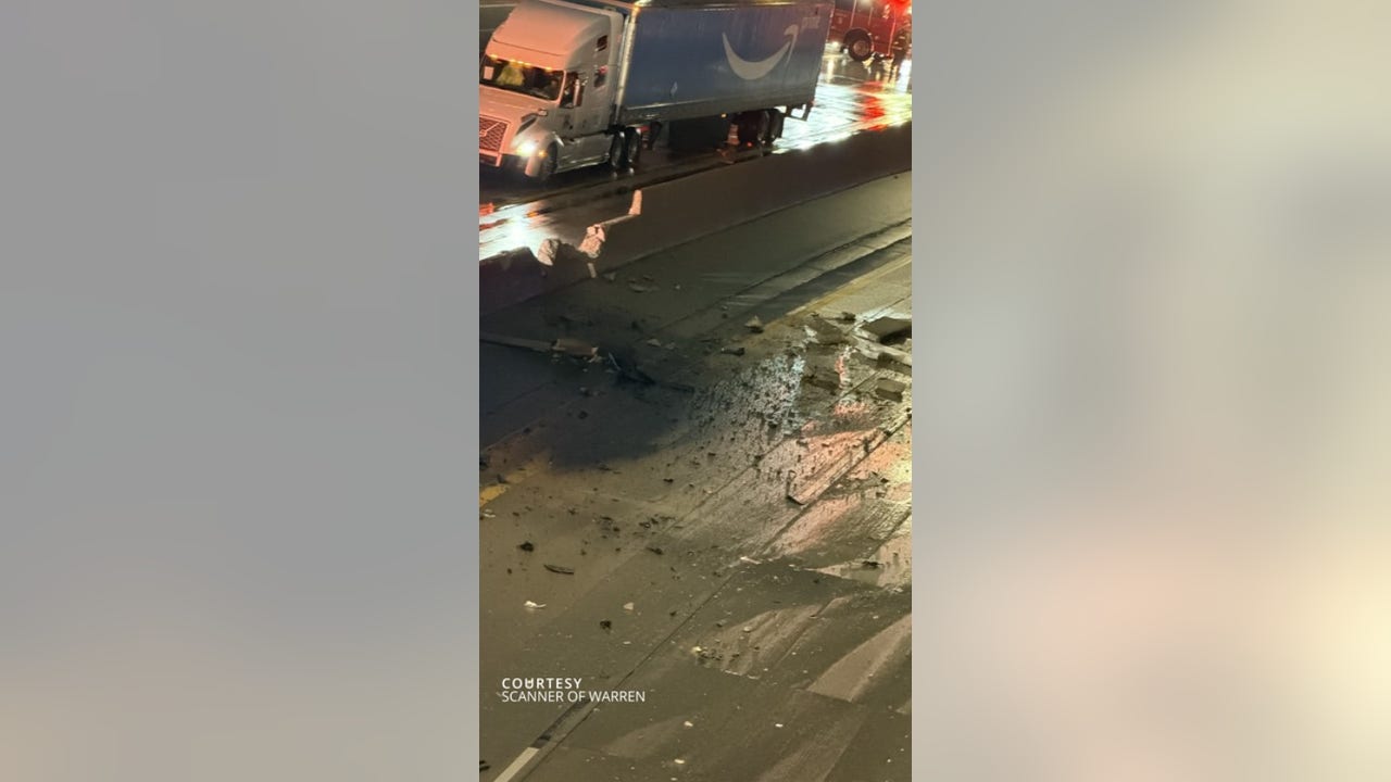 Images coming from the area show the semi-truck jackknifed on the westbound side of the highway and the median in pieces.