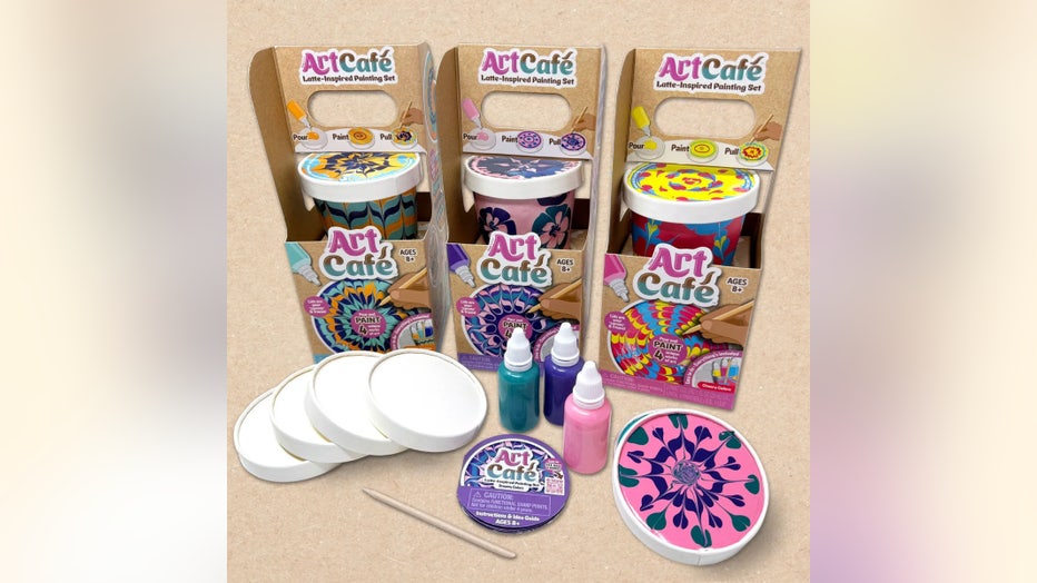 Create vibrant, latte-inspired paintings with Art Café. These fun, portable sets let you pour and paint 4 unique artworks using a simple "pour & pull" technique, inspired by latte art and trendy designer cookies. Just pour colorful paint onto the no-drip canvas using fine-tip bottles, then pull a pick through the patterns to create mesmerizing, swirling designs. | Buy It