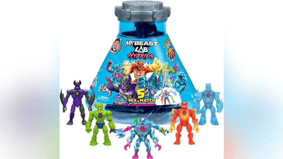 The experiment begins with the MrBeast Lab vessel—twist and crack open the lid to reveal a massive strip of 13 sealed foil bags. Rip them open to uncover individual beast parts to create 5 epic action figures, including the Mega Torso Panther. Continue the experiment by placing the Super Hybrid figure into the vessel and adding water. Pour, swirl and reveal your Hybrid's true color. More than 30 Beasts to collect, including Rare, Ultra Rare and Premium Editions. | Buy It