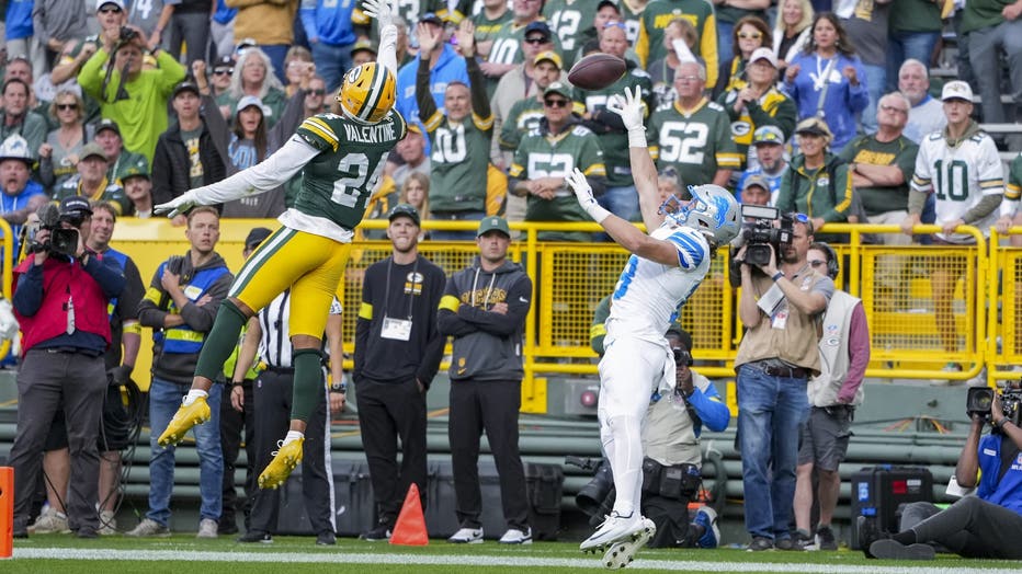 GREEN BAY, WISCONSIN - SEPTEMBER 7: Isaac TeSlaa #18 of the Detroit Lions catches a touchdown during an NFL football game against the Green Bay Packers at Lambeau Field on September 7, 2025 in Green Bay, Wisconsin. (Photo by Todd Rosenberg/Getty Imag