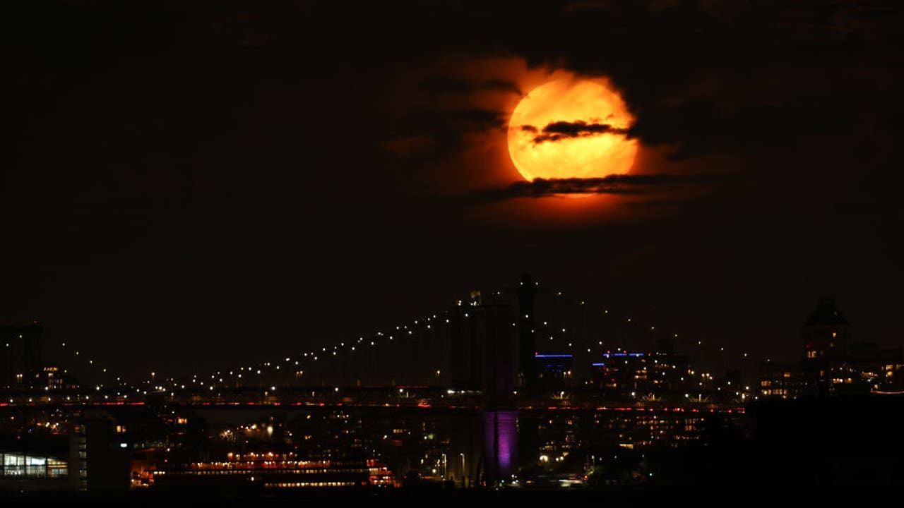 NEW YORK, NY - OCTOBER 20: Full moon also known as "Hunter's Moon" rises behind the Brooklyn Bridge in New York City, as seen from Jersey City of New Jersey in United States on October 21, 2021. (Photo by Tayfun Coskun/Anadolu Agency via Getty Images