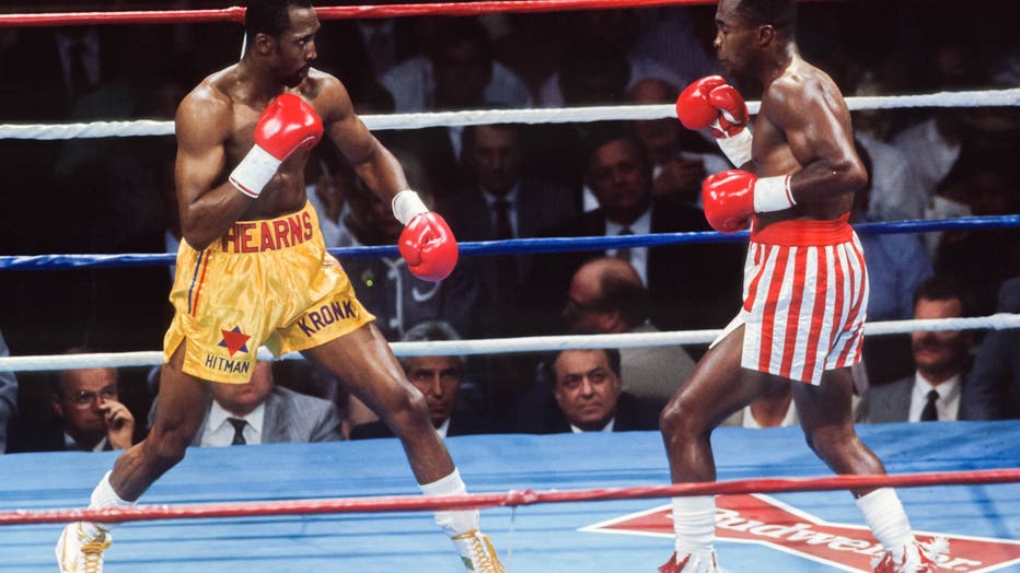 LAS VEGAS, NV - JUNE 12: Sugar Ray Leonard (RED) and Thomas Hearns II (YELLOW) fight for the WBC and WBO Super Middleweight Title on June 12, 1989 at Caesar's Palace, Las Vegas, Nevada. (Photo by David Madison/Getty Images)