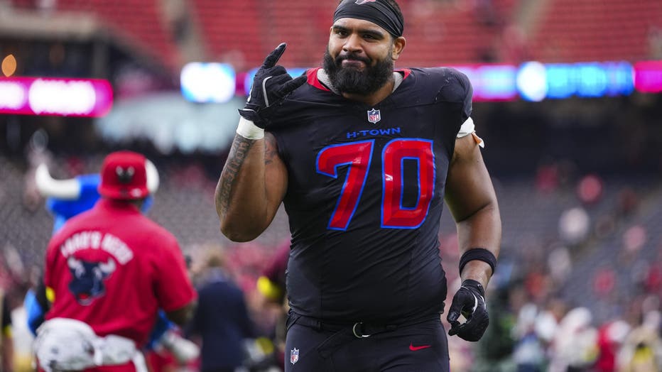HOUSTON, TX - OCTOBER 26: Juice Scruggs #70 of the Houston Texans exits the field after an NFL football game against the San Francisco 49ers at NRG Stadium on October 26, 2025 in Houston, Texas. (Photo by Cooper Neill/Getty Images)