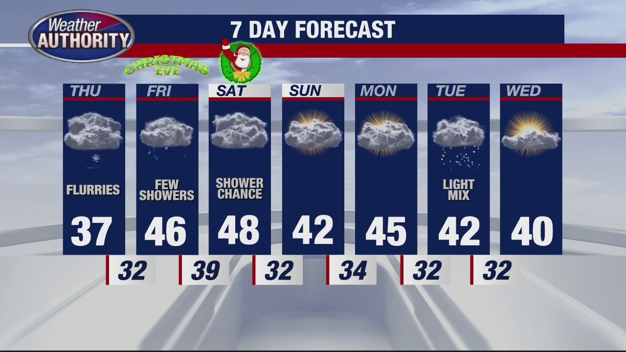 Saturday, Christmas Day, will be cloudy and mile with a high of 48, and some rain showers are expected.