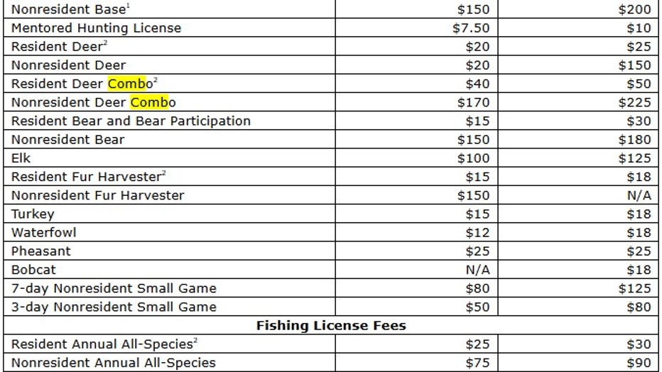 Proposed license fee hikes for hunting and fishing in Michigan. Table via Senate Fiscal Agency.