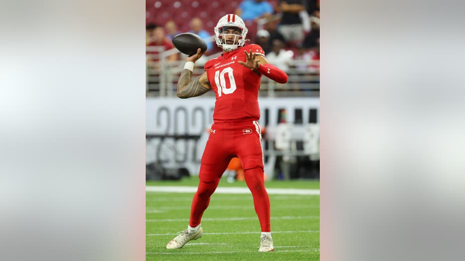 ST LOUIS, MISSOURI - JUNE 14: Jordan Ta’amu #10 of DC Defender passes the ball against the Michigan Panthers during the first quarter of the UFL Championship game at The Dome at America’s Center on June 14, 2025 in St Louis, Missouri. (Photo by Dilip