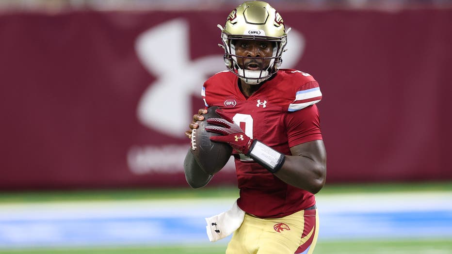 DETROIT, MICHIGAN - APRIL 18: Bryce Perkins #3 of Michigan Panthers plays against the Memphis Showboats at Ford Field on April 18, 2025 in Detroit, Michigan. (Photo by Gregory Shamus/UFL/Getty Images)