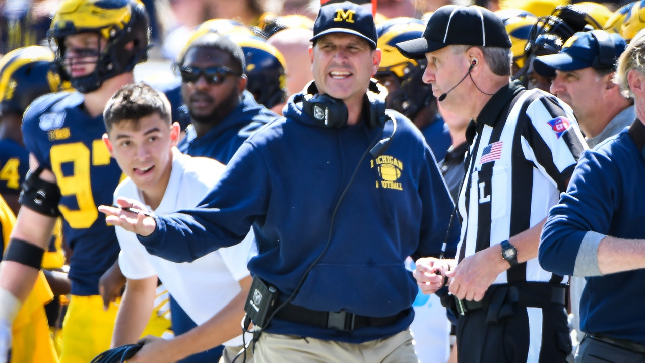 ANN ARBOR, MI - SEPTEMBER 07: Michigan Wolverines head coach argues with a referee during the Michigan Wolverines versus Army Black Knights game on Saturday September 7, 2019 at Michigan Stadium in Ann Arbor, MI.(Photo by Steven King/Icon Sportswire