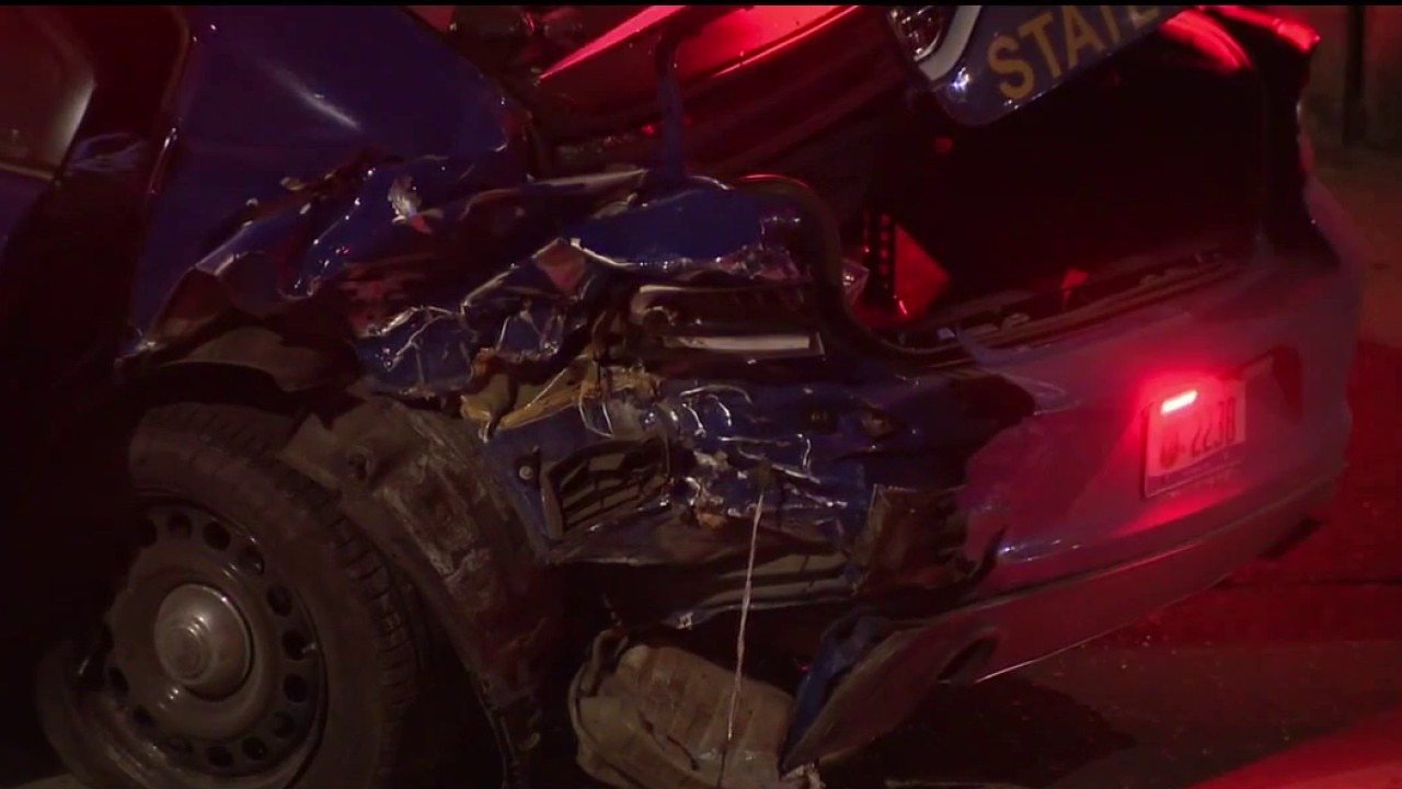 The crash happened Sunday night in the southbound lanes of the Lodge. MSP says a trooper was tending to a crash around 7:50 p.m. when a Jeep SUV suddenly hit the patrol car from behind, pushing it into a wall.