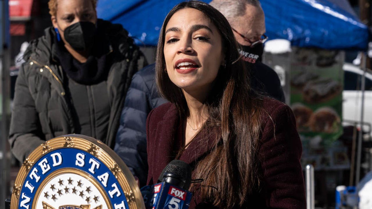 FILE - Rep. Alexandria Ocasio-Cortez speaks during joint announcement with Senator Chuck Schumer on Feb. 8, 2021 in New York City. (Photo by Lev Radin/Pacific Press/LightRocket via Getty Images)