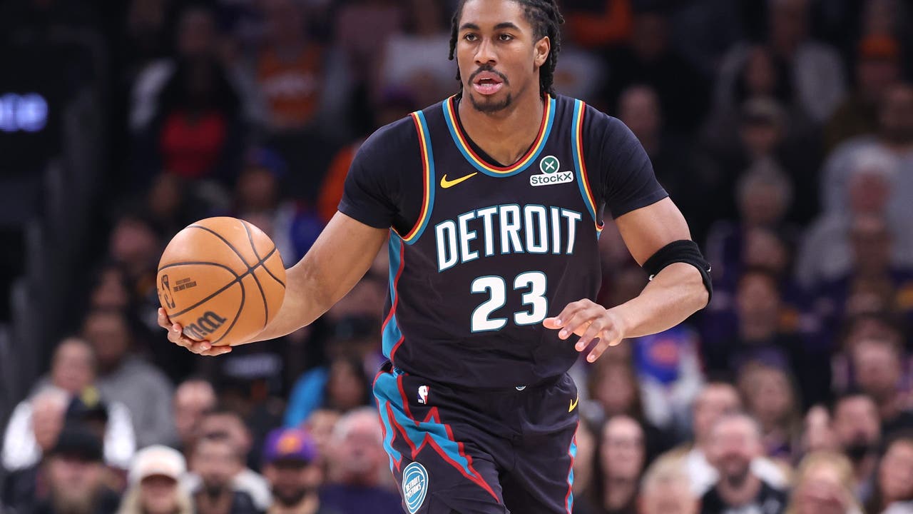 PHOENIX, ARIZONA - JANUARY 29: Jaden Ivey #23 of the Detroit Pistons dribbles the ball during the first half against the Phoenix Suns at Mortgage Matchup Center on January 29, 2026 in Phoenix, Arizona. The Suns defeated the Pistons 114-96. NOTE TO US