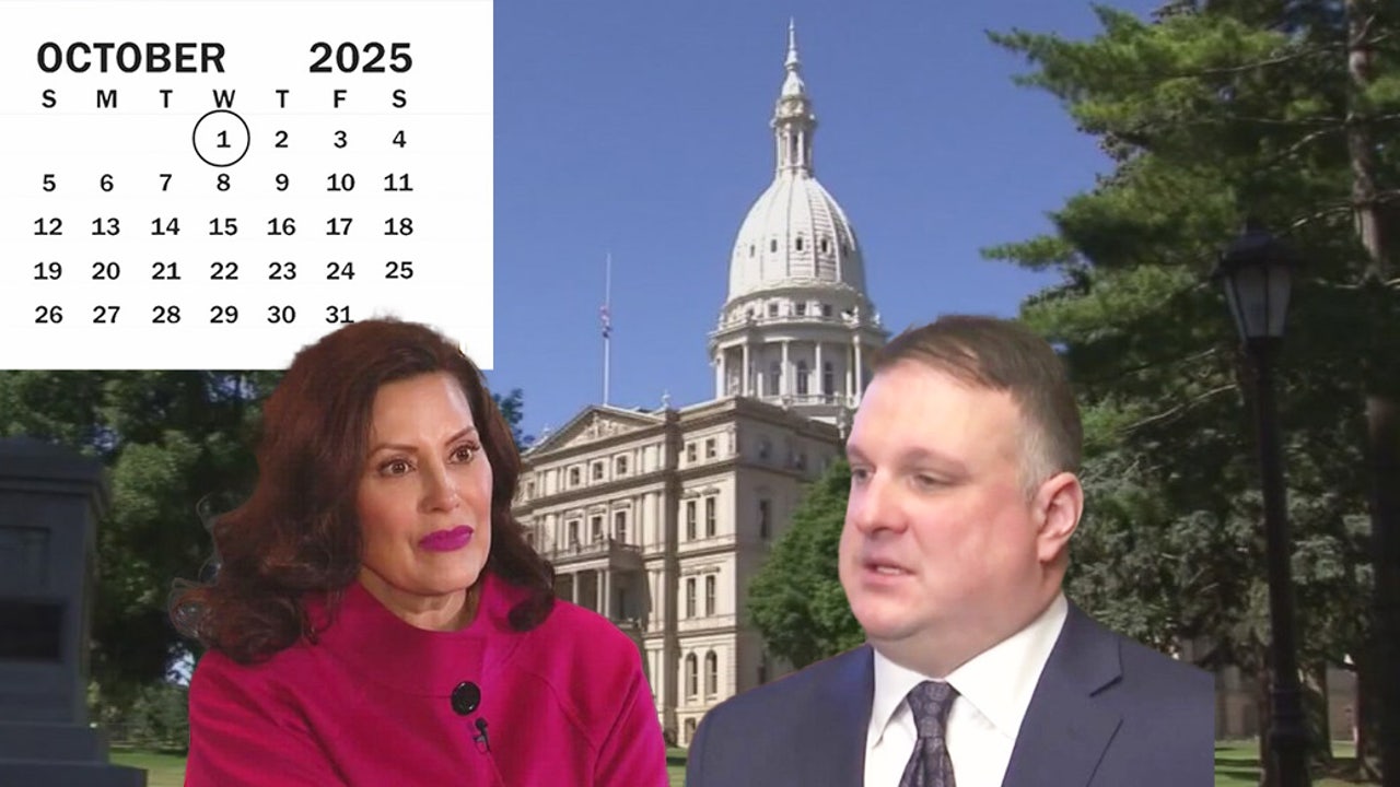 Photo art depicts Oct. 1 deadline, top left, Gov. Gretchen Whitmer, left and GOP Speaker Matt Hall.