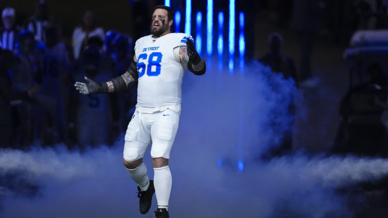 DETROIT, MI - DECEMBER 04: Taylor Decker #68 of the Detroit Lions runs out of the tunnel prior to an NFL football game against the Dallas Cowboys at Ford Field on December 4, 2025 in Detroit, Michigan. (Photo by Cooper Neill/Getty Images)