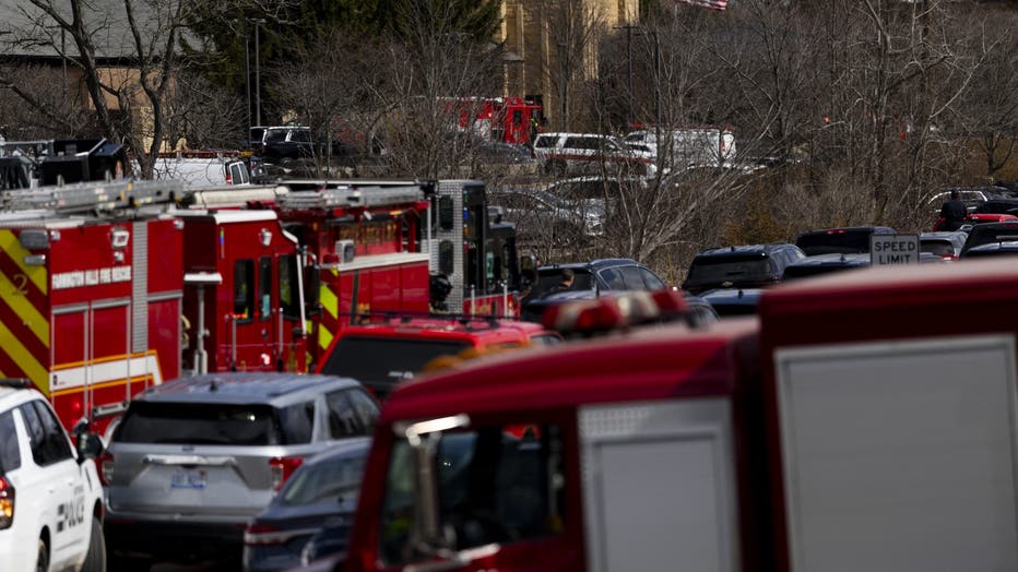 WEST BLOOMFIELD, MICHIGAN - MARCH 12: Law enforcement respond near Temple Israel following reports of an active shooter on March 12, 2026 in West Bloomfield, Michigan. According to authorities a suspect is dead after ramming a vehicle into the Detroi