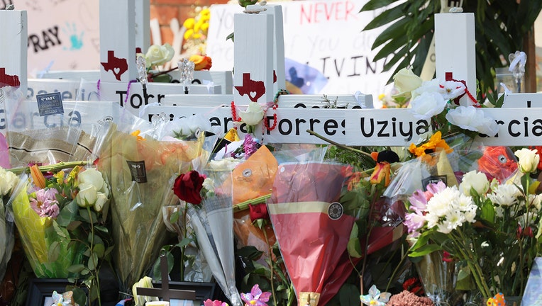 UVALDE, TEXAS - MAY 27: A memorial for victims of the mass shooting at Robb Elementary School is seen on May 27, 2022 in Uvalde, Texas. Steven C. McCraw, Director and Colonel of the Texas Department of Public Safety, held a press conference to give a