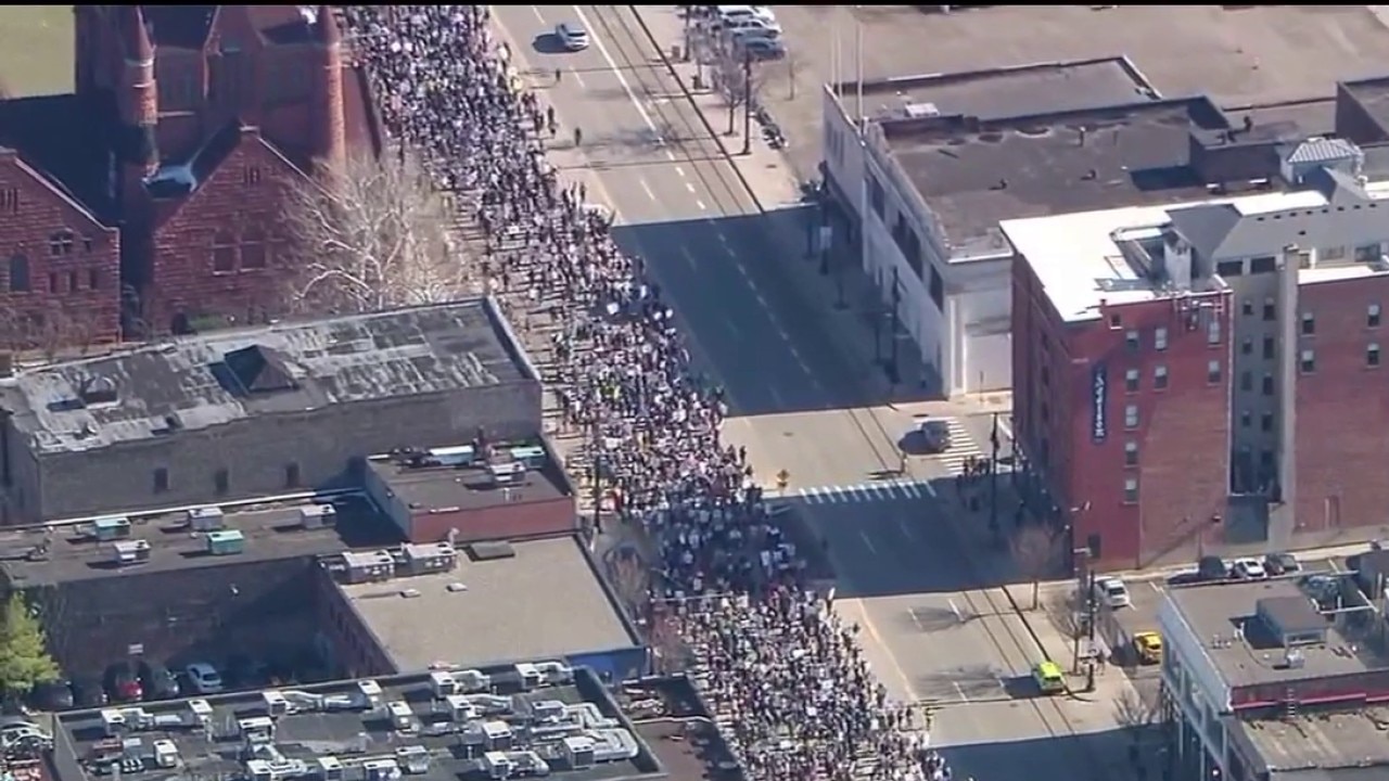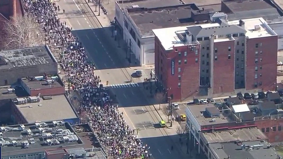 As the downtown Detroit rally ended, protesters marched up Woodward Avenue carrying signs, prompting police to temporarily shut down the road.