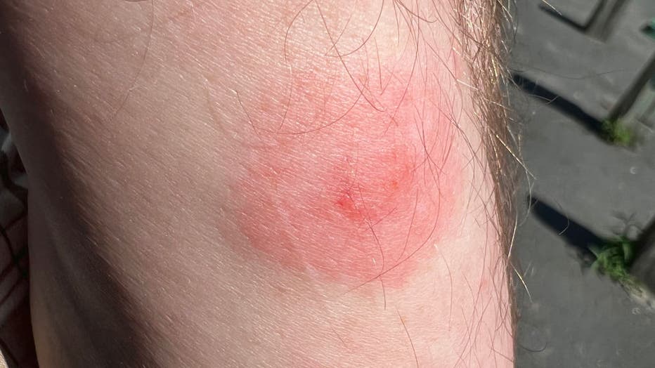 Tick bite on the forearm of a man in Toronto, Ontario, Canada, on July 07, 2023. Experts predict bad year for ticks as disease-carrying bugs expand range in Canada. The prevalence of ticks that can carry Lyme disease is expected to be higher than eve
