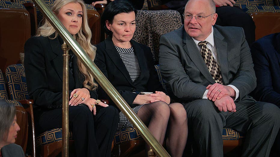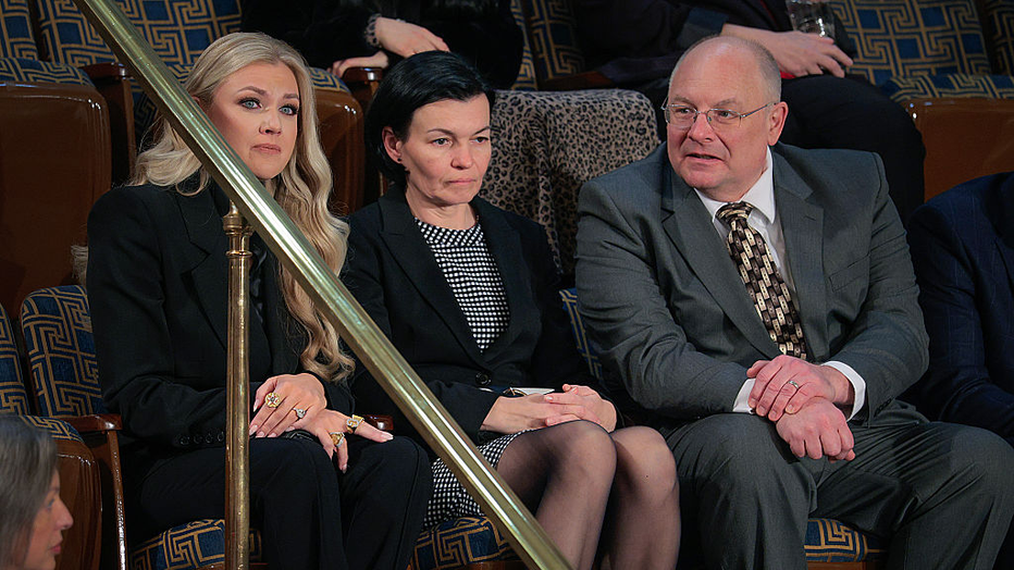 Erika Kirk (L) waits for the start of the Union address during a Joint Session of Congress at the U.S. Capitol on February 24, 2026, in Washington, DC. Trump delivered his address days after the Supreme Court struck down the administration's tariff s