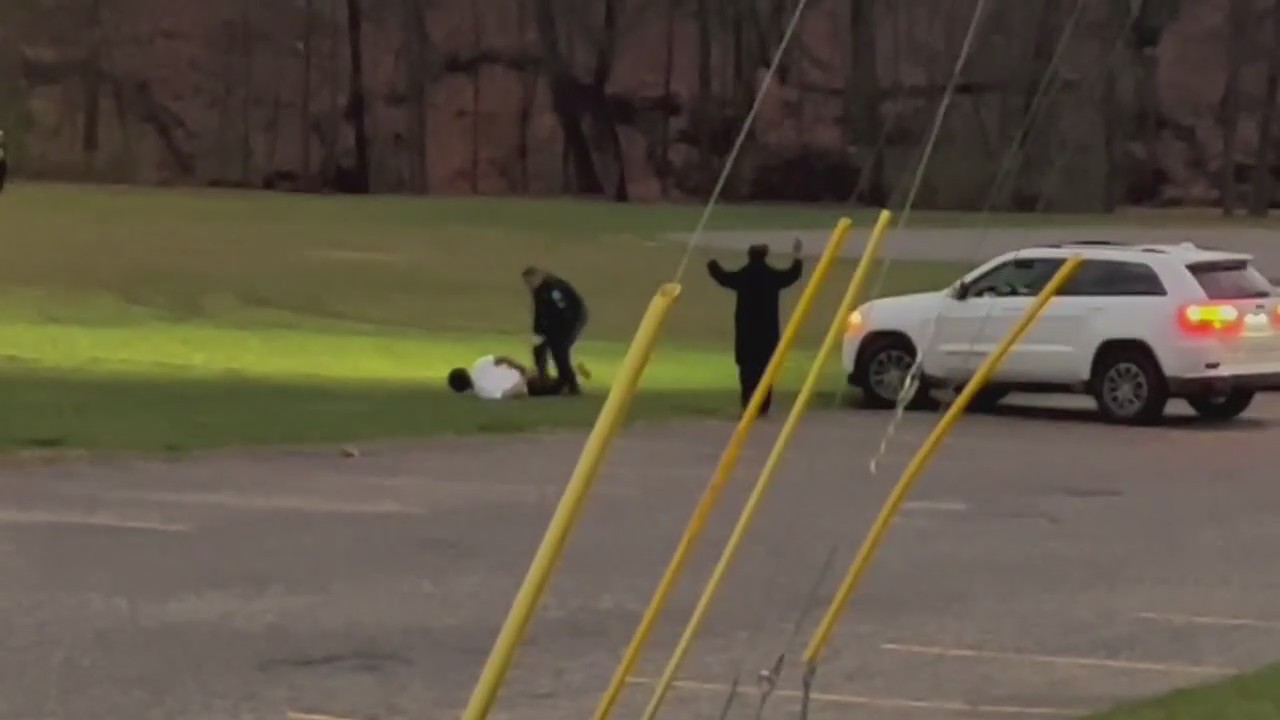 It all took place around 5:30 p.m. on Sunday. The video shows an officer forcing the suspect in handcuffs to the ground as another person watches with their hands up.