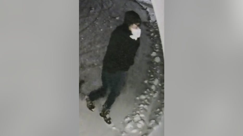 The suspect is described as male or female, thin to medium build, wearing glasses and black attire.