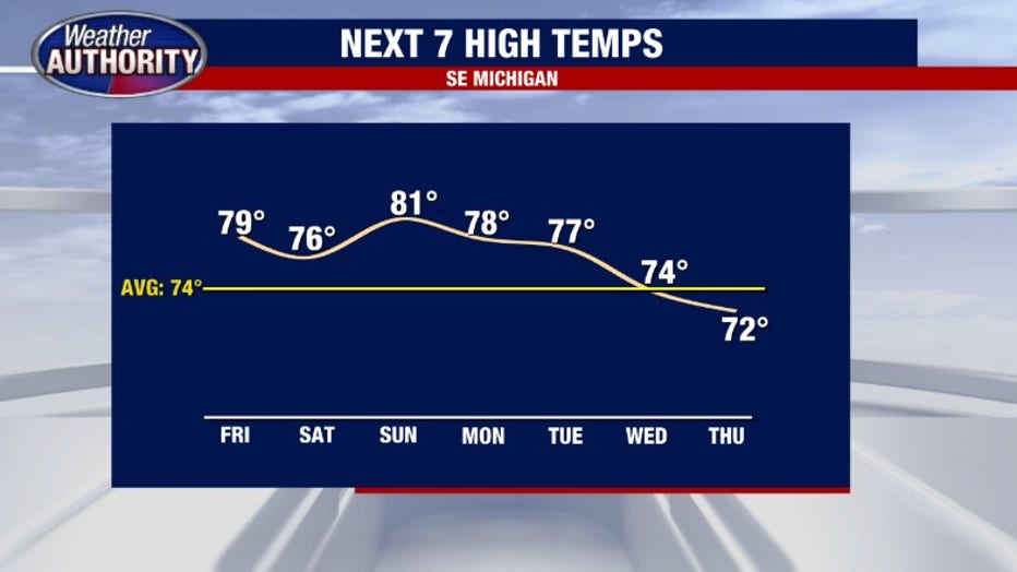 Highs land in the 70s for most, cooler near Lake Huron and warmer the farther south and west you go.