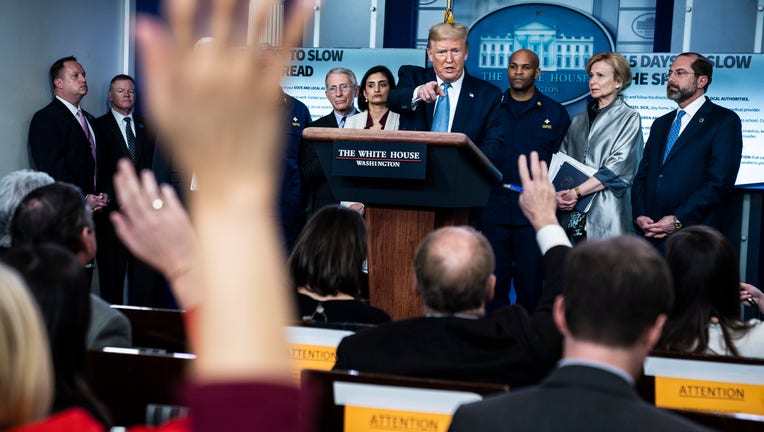 WASHINGTON, DC - MARCH 16 : President Donald J. Trump announces that the outbreak could last months and gatherings should be limited to 10 people with his coronavirus task force in response to the COVID-19 coronavirus pandemic during a briefing in th