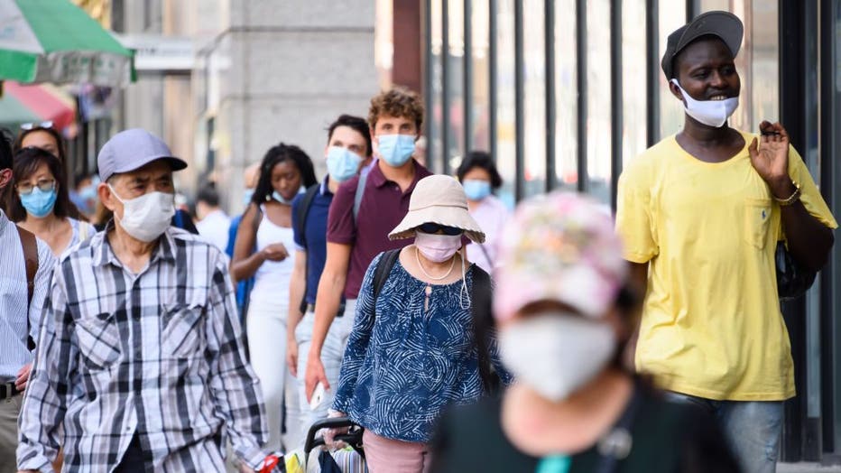 People wear protective face masks in China Town as the city continues Phase 4 of re-opening following restrictions imposed to slow the spread of coronavirus on August 3, 2020, in New York City. (Photo by Noam Galai/Getty Images)