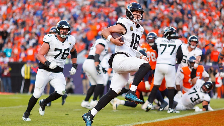FILE-Trevor Lawrence #16 of the Jacksonville Jaguars runs for a third quarter touchdown against the Denver Broncos at Empower Field At Mile High on December 21, 2025 in Denver, Colorado. (Photo by Justin Edmonds/Getty Images)