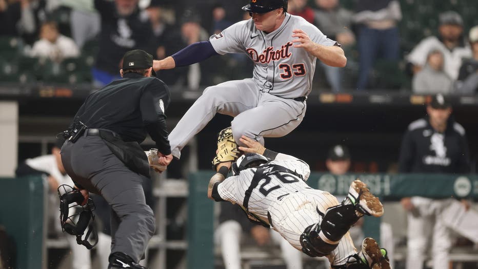 CHICAGO, ILLINOIS - JUNE 04: Colt Keith #33 of the Detroit Tigers is tagged out at home by Korey Lee #26 of the Chicago White Sox during the eighth inning at Rate Field on June 04, 2025 in Chicago, Illinois. (Photo by Michael Reaves/Getty Images)