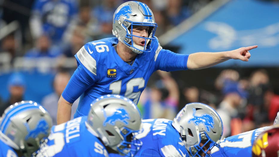DETROIT,MICHIGAN-JANUARY 18: Quarterback Jared Goff (16) of the Detroit Lions calls a play during an NFL Divisional Round game between the Detroit Lions and the Washington Commanders in Detroit, Michigan USA, on Saturday, January 18, 2025. (Photo by