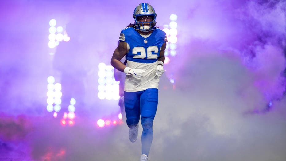 DETROIT, MICHIGAN - JANUARY 18: Jahmyr Gibbs #26 of the Detroit Lions takes the field prior to an NFL Football game against the Washington Commanders at Ford Field on January 18, 2025 in Detroit, Michigan. (Photo by Michael Owens/Getty Images)