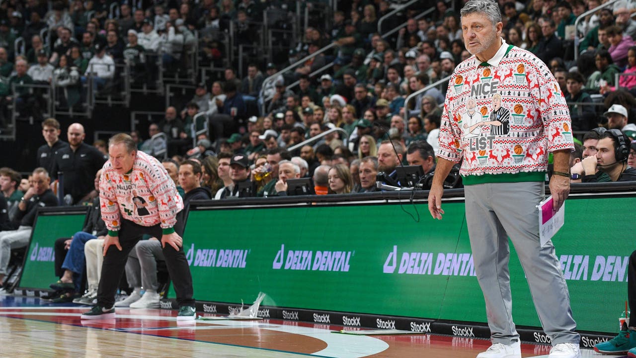 Michigan State coach Tom Izzo and Oakland coach Greg Kampe, who are friends, coordinated to wear custom-made holiday sweaters. Izzo’s had "naughty list" on it with his likeness arguing with a referee. Kampe’s had "nice list" on it with him bumping fists with an official.