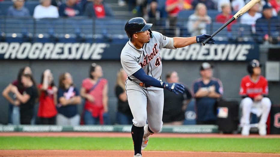 CLEVELAND, OHIO - SEPTEMBER 25: Wenceel Pérez #46 of the Detroit Tigers hits a solo homer during the first inning against the Cleveland Guardians at Progressive Field on September 25, 2025 in Cleveland, Ohio. (Photo by Jason Miller/Getty Images)