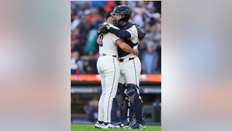 DETROIT, MI - OCTOBER 08: Will Vest #19 and Dillon Dingler #13 of the Detroit Tigers celebrate after defeating the Seattle Mariners in Game Four of the American League Division Series presented by Booking.com at Comerica Park on Wednesday, October 8,