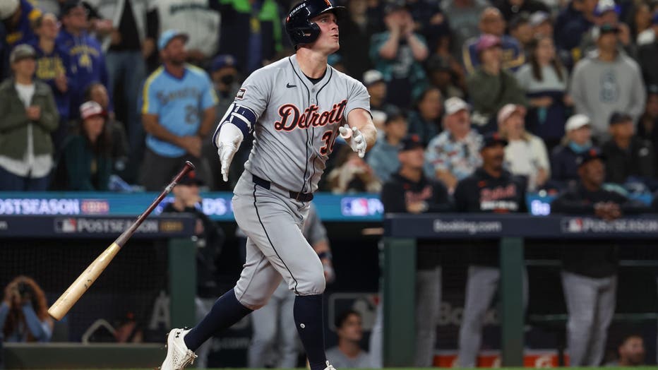 SEATTLE, WA - OCTOBER 04: Kerry Carpenter #30 of the Detroit Tigers hits a two-run home run in the fifth inning during Game One of the American League Division Series presented by Booking.com between the Detroit Tigers and the Seattle Mariners at T-M