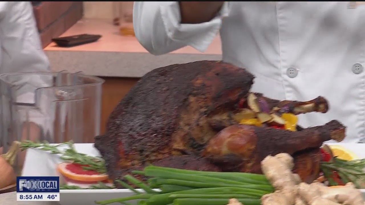 Chef Kayrone’s Jerk Turkey Ingredients: • 1 tablespoon allspice (ground) • 1 tablespoon thyme (dried, or fresh if possible) • 1 tablespoon cinnamon (ground) • 1 tablespoon nutmeg (ground) • 1 tablespoon brown sugar • 1 teaspoon salt • 1 teaspoon black pepper • 1–2 scotch bonnet peppers (adjust based on desired spice level), seeded and chopped • 6 cloves garlic, minced • 1 medium onion, chopped • 4–5 green onions, chopped • 2 tablespoons soy sauce • 2 tablespoons vegetable oil • 1/4 cup fresh lime juice (or juice of 2 limes) • 1/4 cup fresh orange juice (optional) Instructions: 1. Blend Ingredients: Combine all ingredients in a blender or food processor until you have a smooth paste. 2. Marinate Turkey: Rub the jerk seasoning thoroughly over your turkey. For best results, marinate in the refrigerator for at least 4 hours or overnight. 3. Cook Turkey: bake the turkey at 350 degrees. Basting with any remaining marinade during cooking will deepen the flavor. ● Unstuffed Turkey: Cook 13 mins per pound ● Stuffed Turkey: Cook 15 min per pound Balsamic Roasted Butternut Squash Ingredients: ● 1 medium Butternut Squash ● 2 Tbsp Olive Oil ● 1 ½ Tbsp Balsamic Vinegar ● Salt and pepper to taste Directions: 1. Begin by pre-heat the oven to 350 degrees F and line a baking sheet with parchment paper. 2. Peel and dice the butternut squash into about ½ inch cubes. 3. Toss in a medium-sized bowl with about 1 TBSP of olive oil, 1 ½ Tbsp of balsamic vinegar, and a few pinches of salt and pepper. 4. Spread onto the baking sheet covered with parchment paper, a bake for 15-20 minutes until tender and slightly browned.